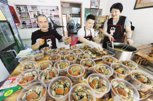 在他的微信“蟹寶寶客服”銷(xiāo)售平臺(tái)上,訂購(gòu)“蟹寶寶”的客戶數(shù)量不斷上升。陳棟說(shuō),他現(xiàn)在每天凌晨2時(shí)多就起床,去上海、昆山等幾個(gè)點(diǎn)收購(gòu)一兩左右的小螃蟹,買(mǎi)回來(lái)后放在清水里養(yǎng)上一天,隨后剪去蟹螯和蟹腳,繼續(xù)清洗后再放進(jìn)準(zhǔn)備好的特殊高湯內(nèi)燒煮,一直要忙到下午1時(shí)許才開(kāi)始裝盒,再通過(guò)快遞及上門(mén)送貨等方式出售。